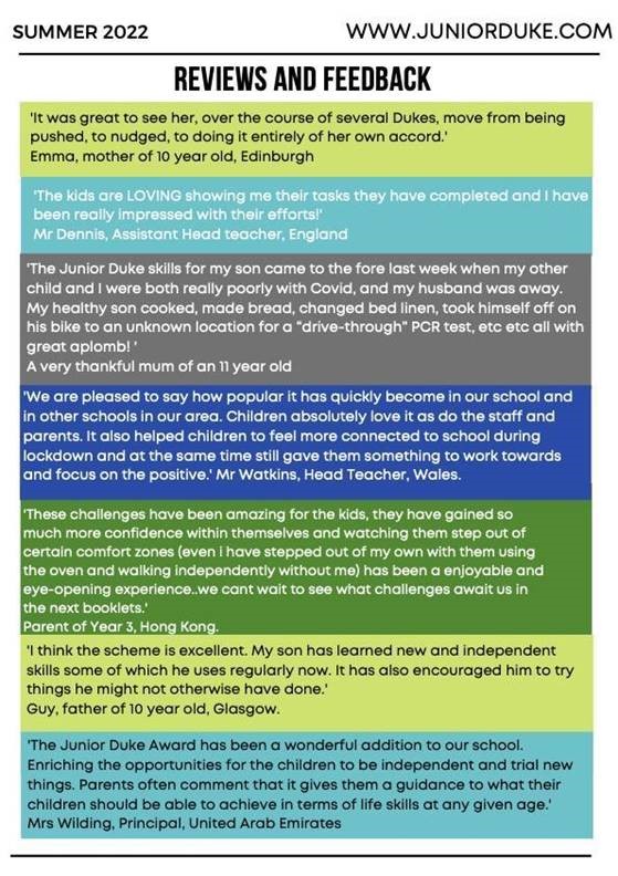Each half-term we host a “Junior Duke Day”, where children can bring their booklets into school for assessment, and there is a drop in before school, at lunchtime and after school on that day.